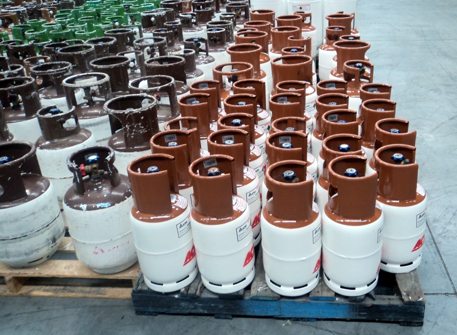 Gas bottles take a significant amount of wear and tear, and require constant repainting before refilling. As the bottles are rarely sorted according to their colour coding and fill requirements, it is easier to into paint all in a special colour code before filling with a particular gas. In this facility, all bottles are painted in a single coat of Congard White. Colours are then overlaid with Metalshield Plus QD Enamel in colours that are standard within the gas industry.